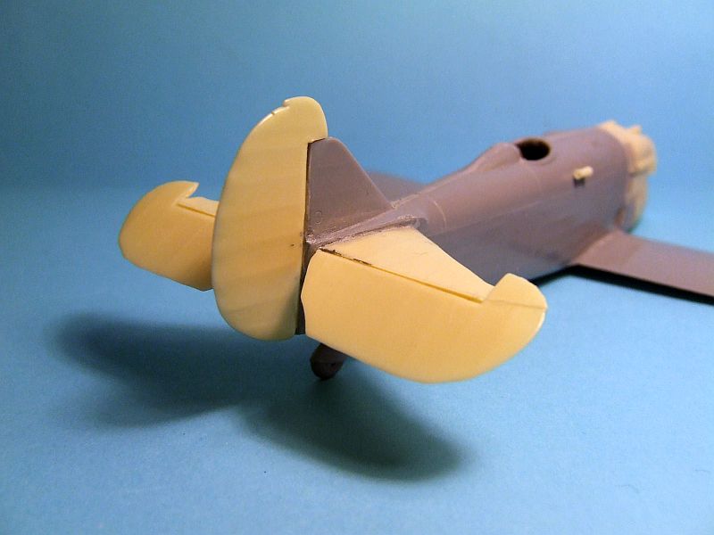 He colocado los timones de cola con piezas de resina que trae el kit, cambiando la posición de los de profundidad, que le dan algo de movimiento al aparato...