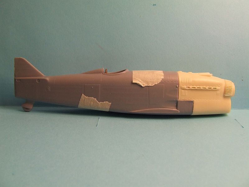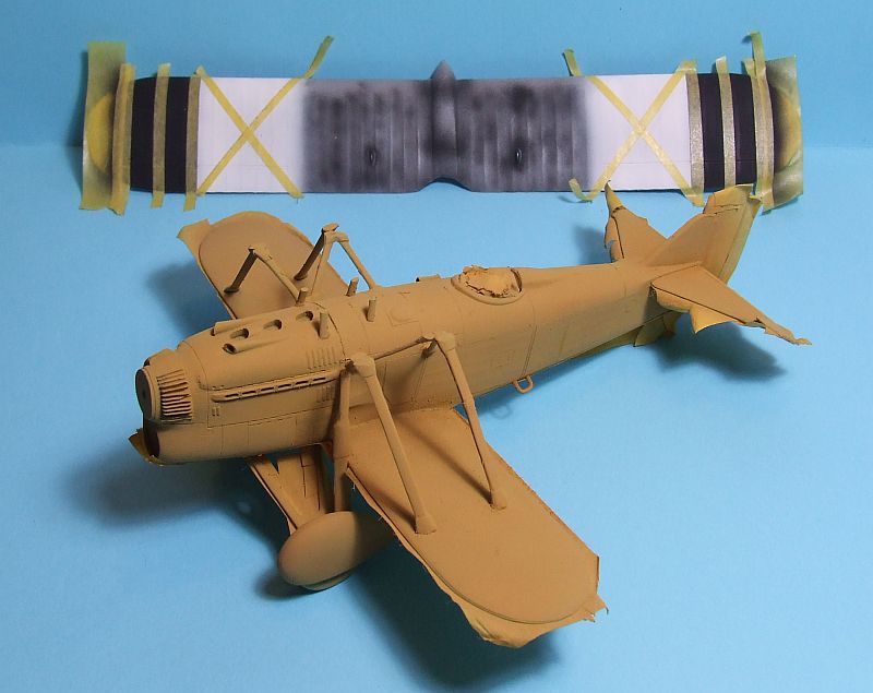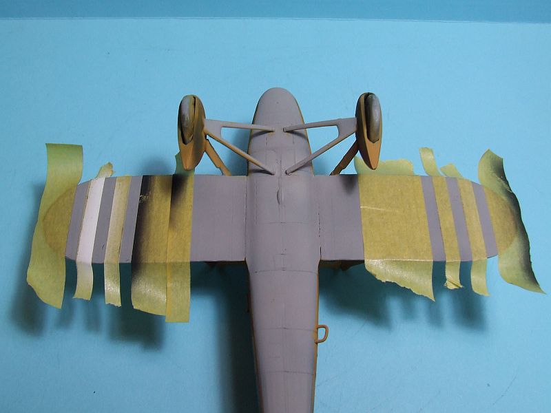 El color base, y la cola pintada en blanco y tapada con cinta tamiya... los montantes irán en color gris claro, pero eso lo pintaré a mano con vallejo, me es más cómodo así, de esta forma puedo usar el aerógrafo para el resto sin preocuparme de proteger los montantes.