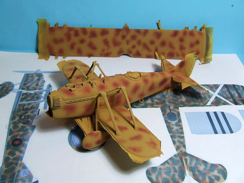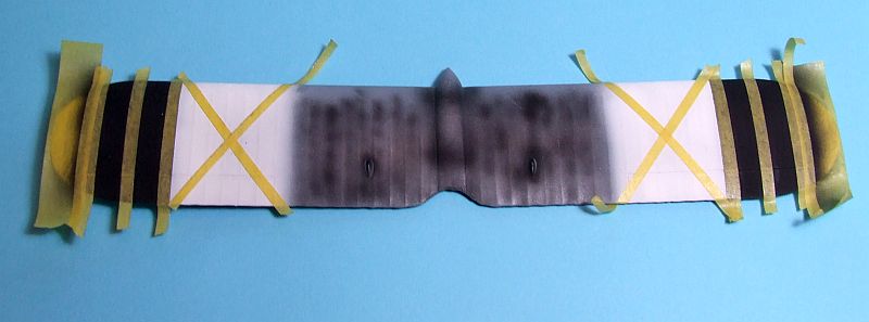 El ala superior con el camuflaje y las mascaras fuera... tengo que retocar 2 lineas negras un poco que tiene un pelín de blanco como veréis