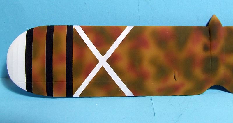 Así que lo que he hecho es pintar las zonas de blanco y negro y luego con cinta tamiya tapar la cruz, las 3 lineas negras y la punta blanca para luego pintar con el color giallo mimético 3 por encima.
